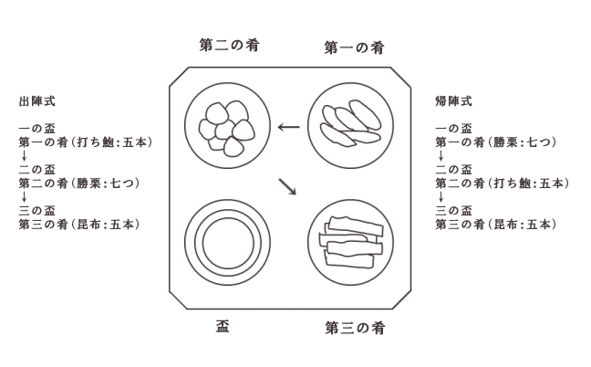 帰陣式 : 勝栗→打ち鮑→昆布 (このいくさに勝ち、この敵を打ち、喜ぶ)
